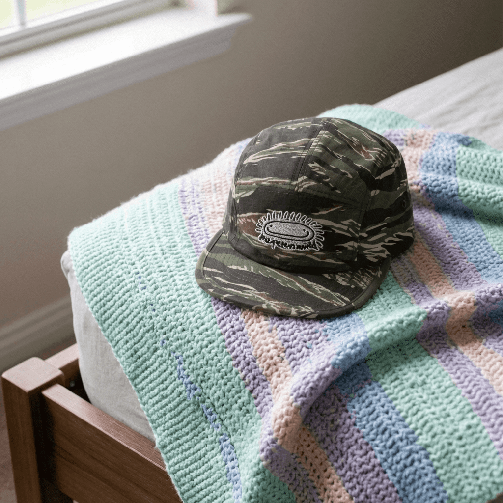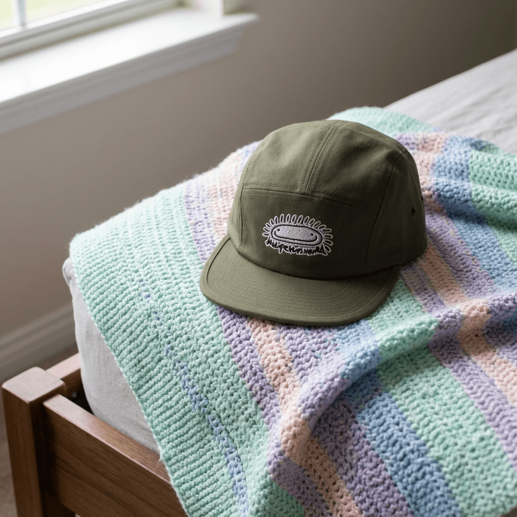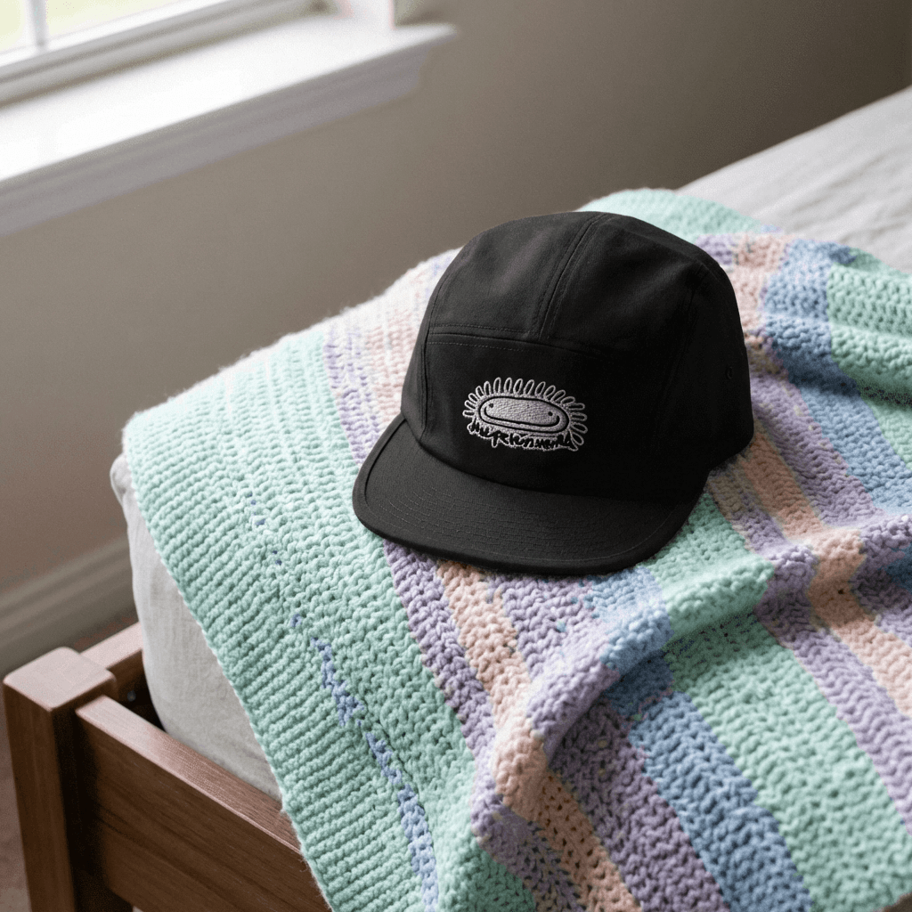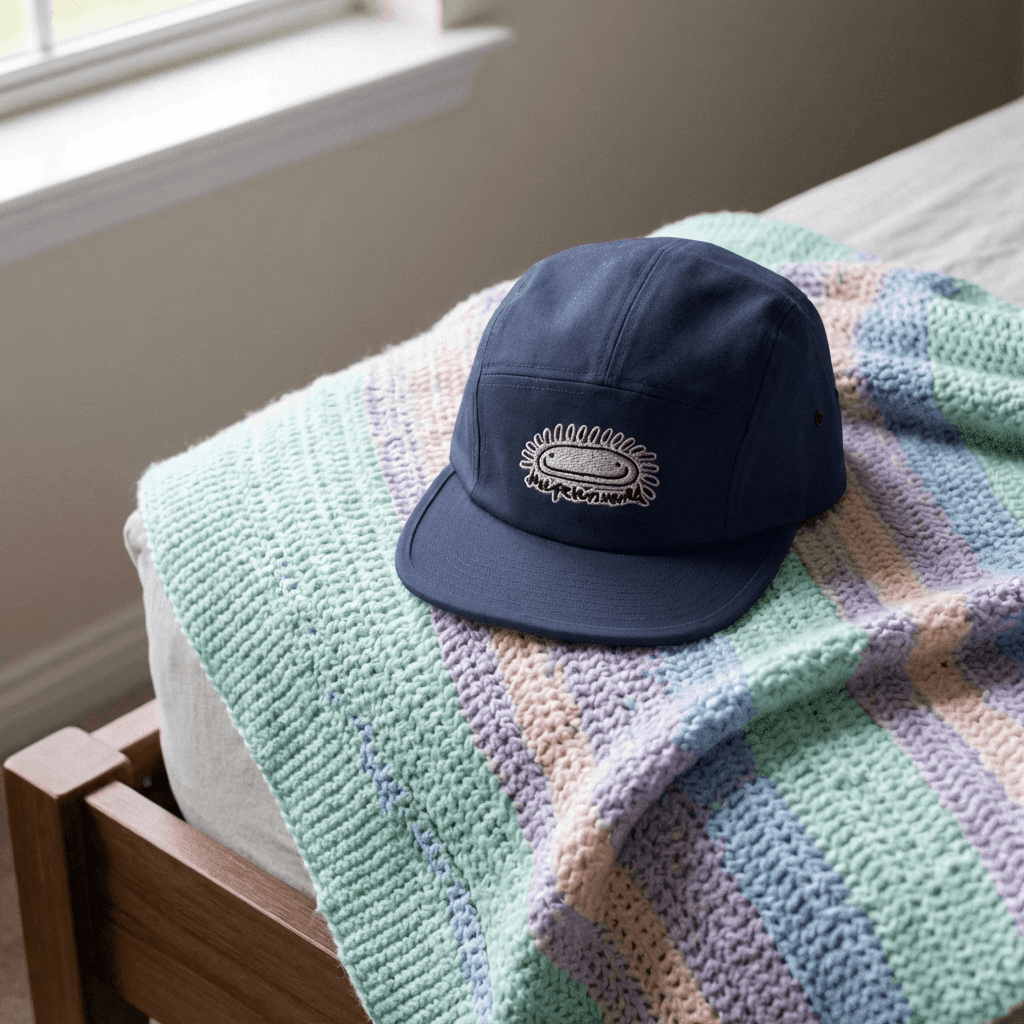 A soft five-panel cotton cap with embroidered Peter. Designed for walking, thinking, forgetting where you put things, and being outside briefly. Works in normal situations.